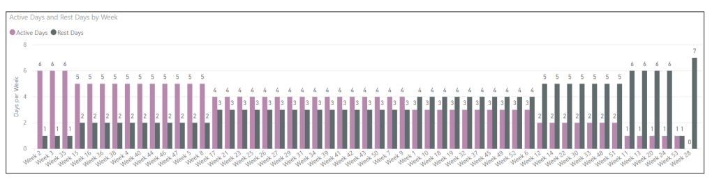 The above graph shows how many days per week I was active, this includes both running and gym days versus how many rest days I took. It is also important to note that the weeks are not ordered chronologically, but go from the most days I was active (6 out of the 7 days) all the way down to the one week where I didn’t work out at all. As you can see, a majority of the weeks were spent with 4 days of working out with 3 days of rest. There was only one week where I took the entire week off. If I remember correctly, this was the week where I had the flu and was bed ridden for most of it. I also had a sold amount of weeks where I worked out 5 of the 7 days. I like how this graph visually breaks down how many days per week I spent working out.