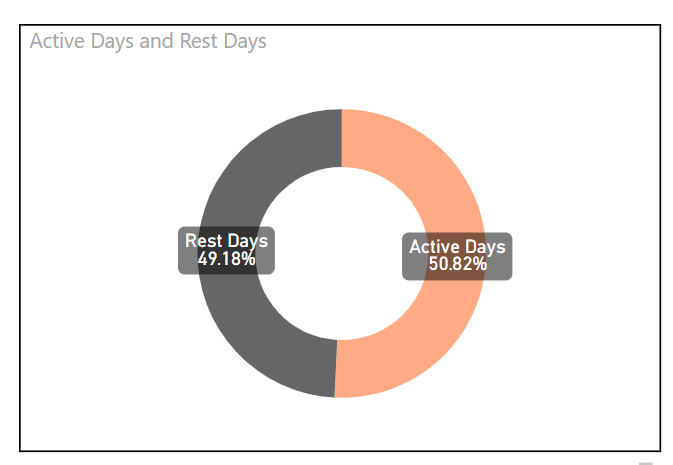 Below is another graph that breaks down how active I was for the whole year. This is the graph on the left and labeled “Active Days and Rest Days”. As you can see, I was active 50.82% of the time. This means I worked out 50% of the year. I broke this information down even further and calculated what percent of my active days were spent running versus how many of those days were spent weight training or doing abs. This can be seen in the far right graph labels “Run Days and Gym Days”. As you can see, there was a fairly even split between gym and run days. Gym days were about 10% higher than my running days. This is something I hope to maintain in 2020, if not push to have more running days over gym days.